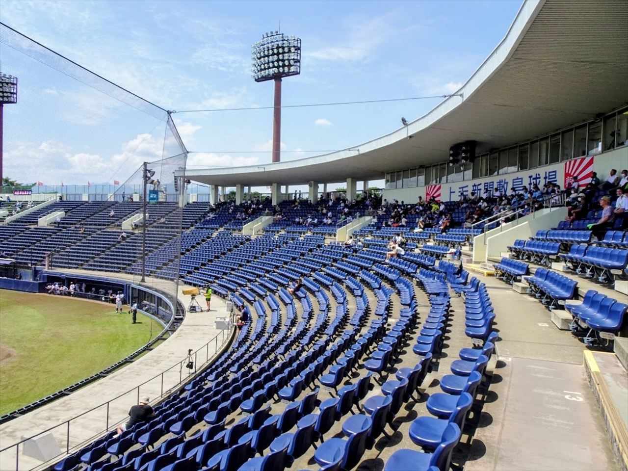 上毛新聞敷島球場の屋根に覆われるエリアはバックネット裏の最上段から8列前後までとなります。