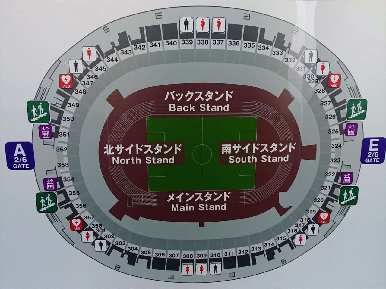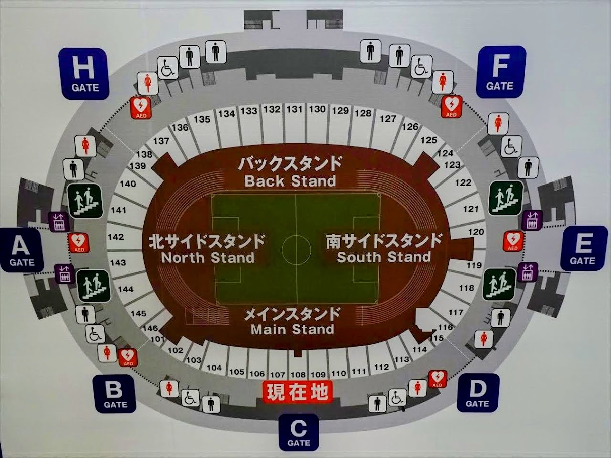 スタジアム中心センターサークル付近のメインスタンドが108ブロック、バックスタンドは131ブロックとなります。