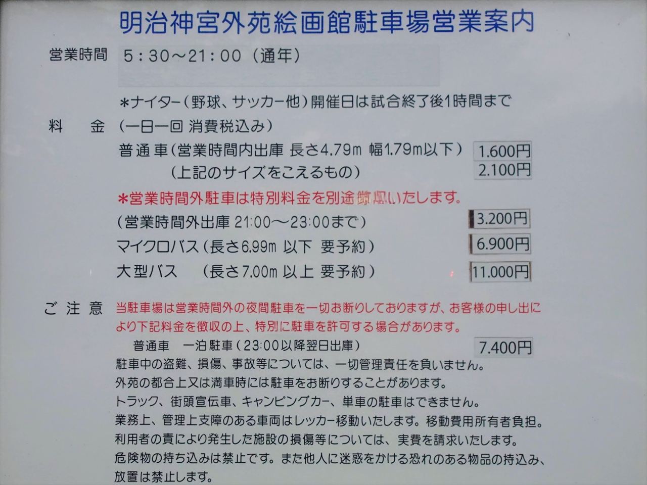 MUFGスタジアム(国立競技場)には駐車場はありませんが、北サイドスタンド(サッカー開催時ホームゴール裏)のAゲート・Hゲートから程近い所に明治神宮外苑絵画館駐車場があります。