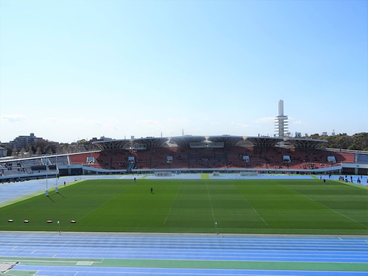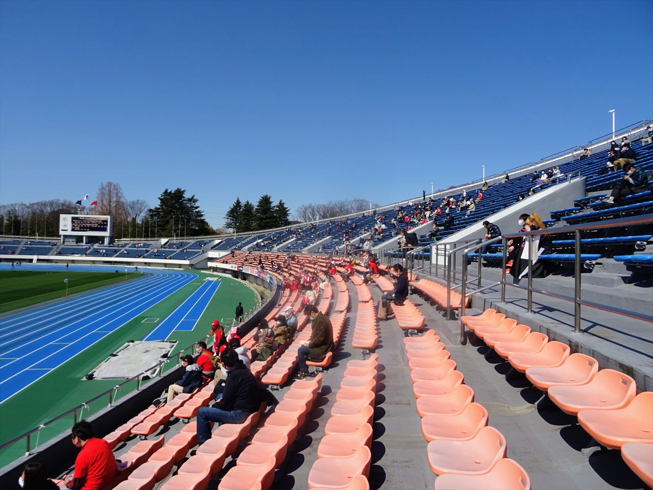 駒沢陸上競技場の屋根に覆われているエリアはメインスタンド20列目付近から最上段にかけてとなりますが、風向きにより覆われるエリアが変動する事があります。