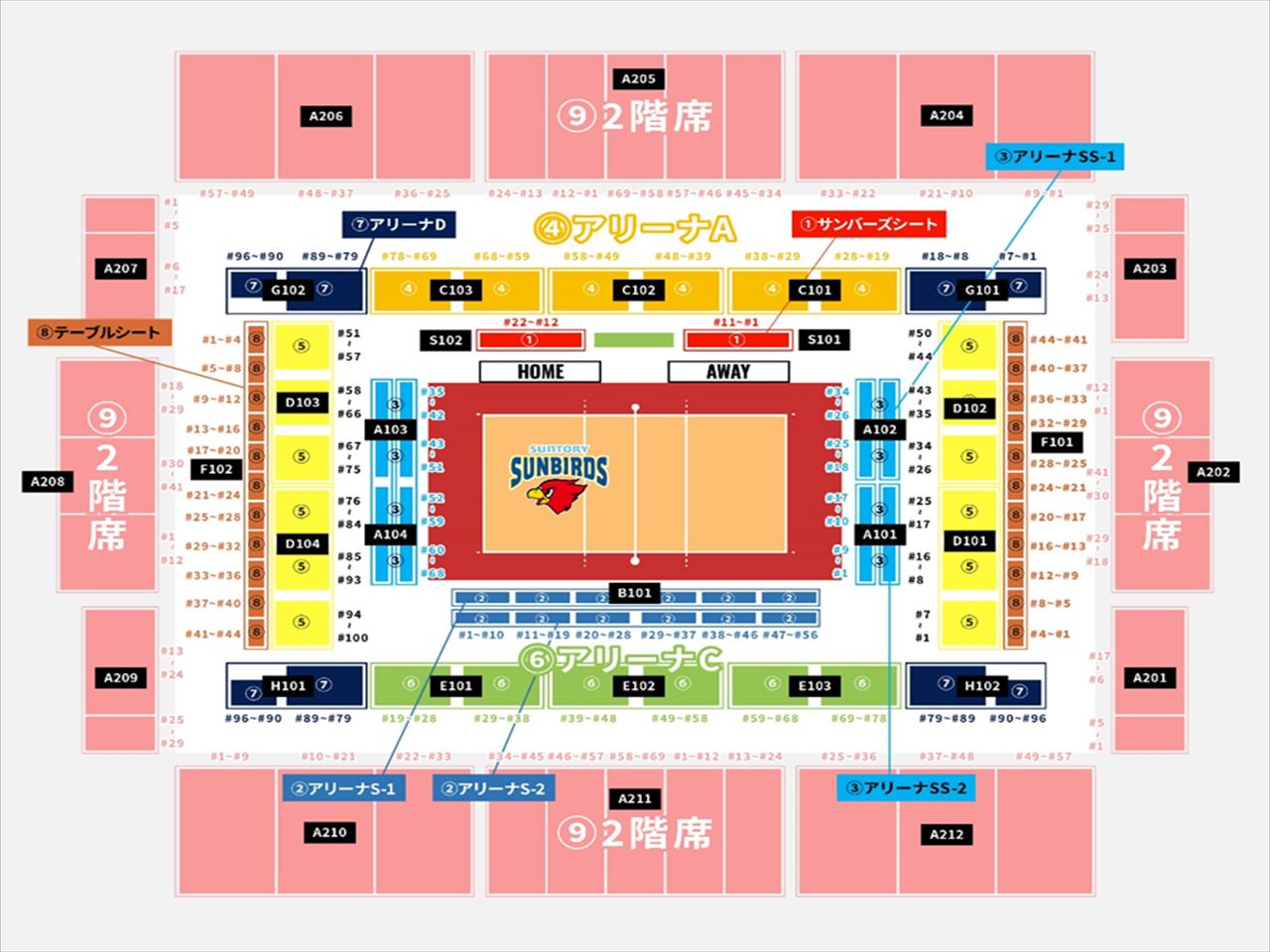 < SVリーグ開催時座席 >SVリーグ開催時座席表は「サントリーサンバーズ大阪」より引用