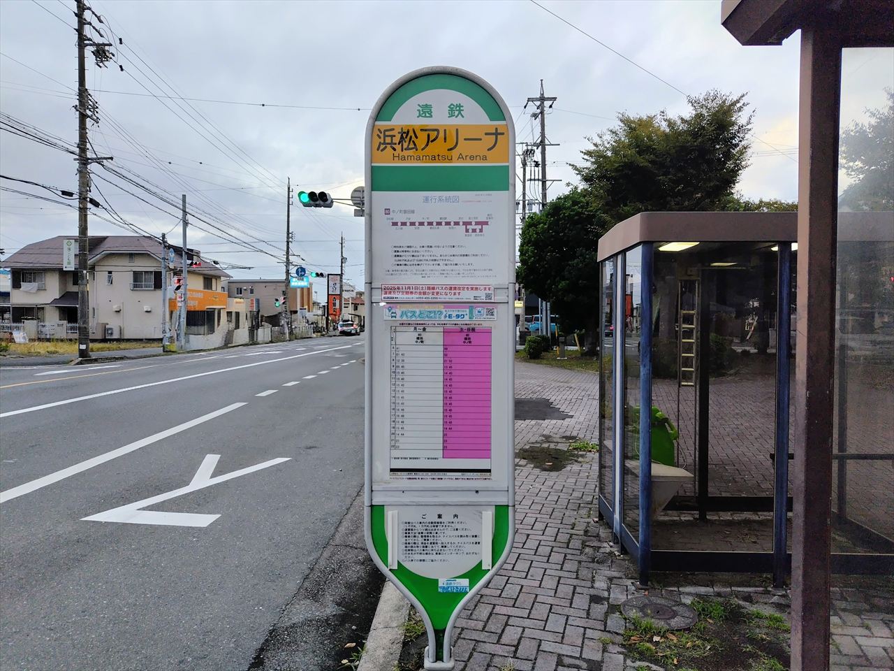 バスは浜松駅バスターミナル9番乗り場から遠州鉄道バスで浜松アリーナ下車徒歩すぐです。