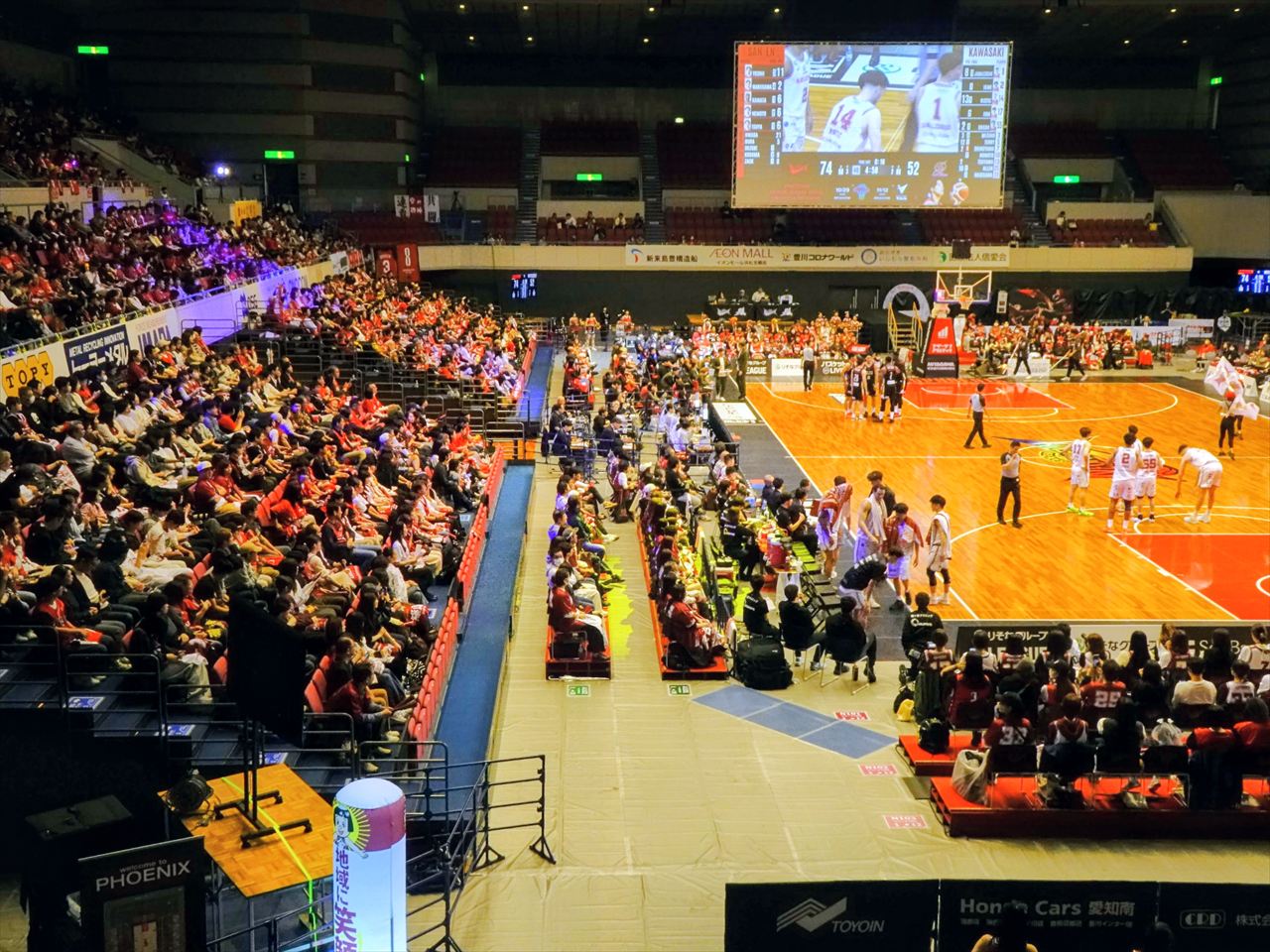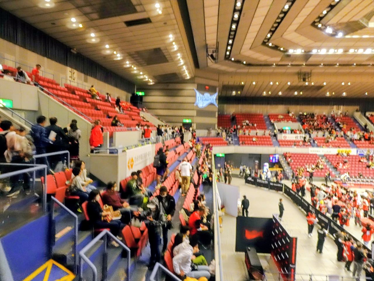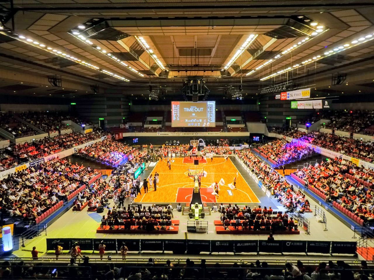 Bリーグ開催時は中央に吊り下げタイプのスコアビジョンはなく南スタンド側のみにスクリーンが設置される事があります。