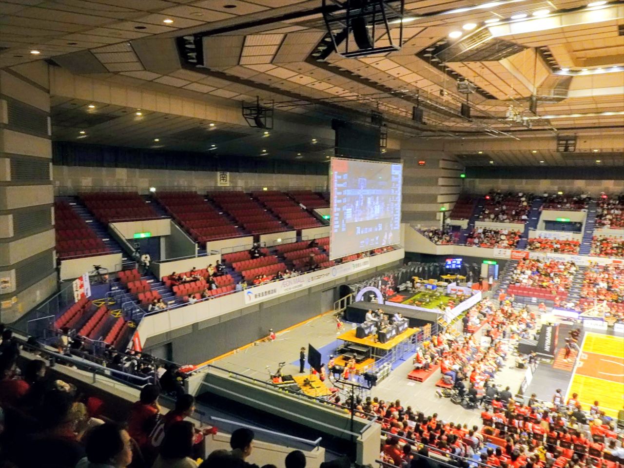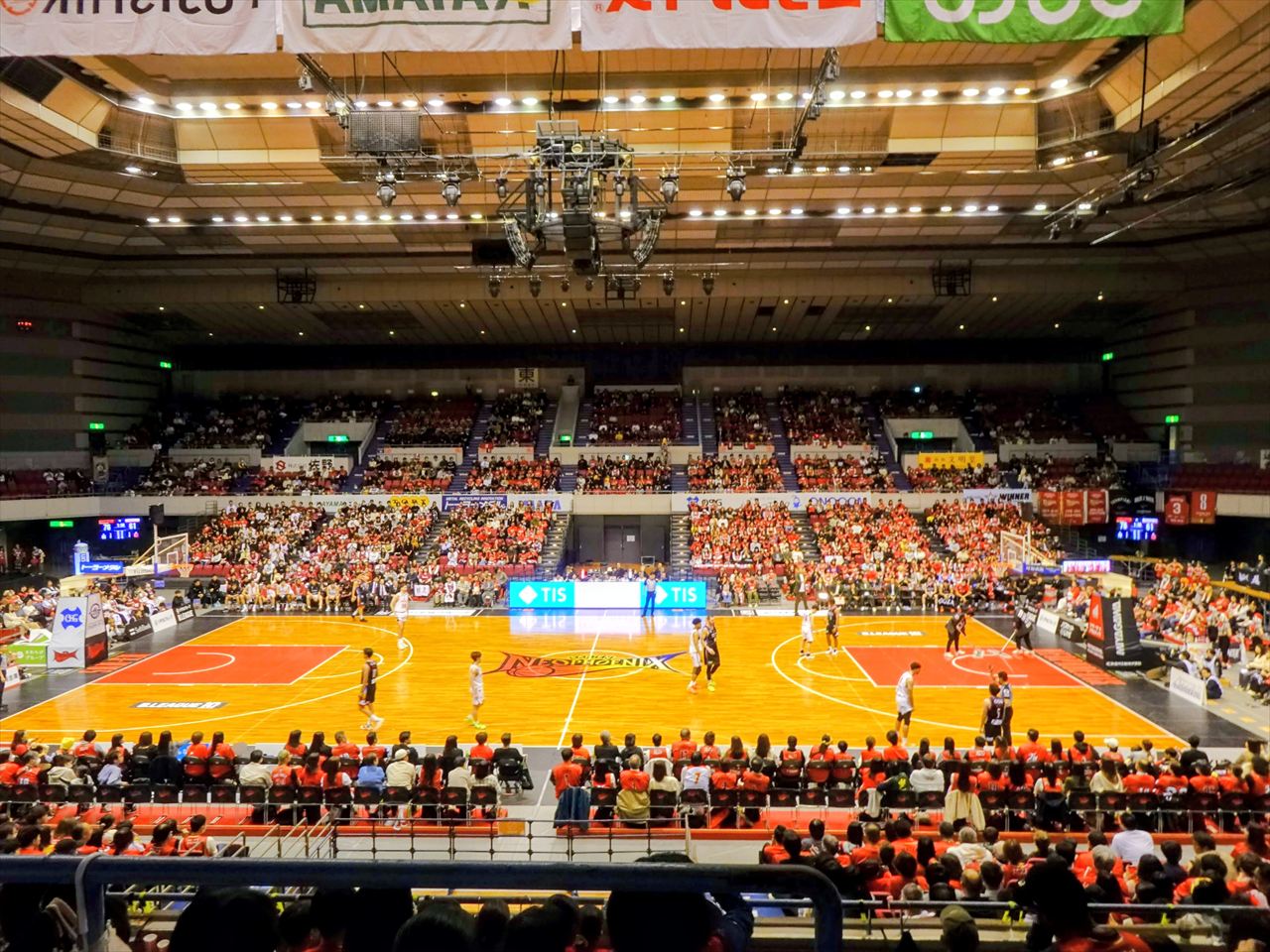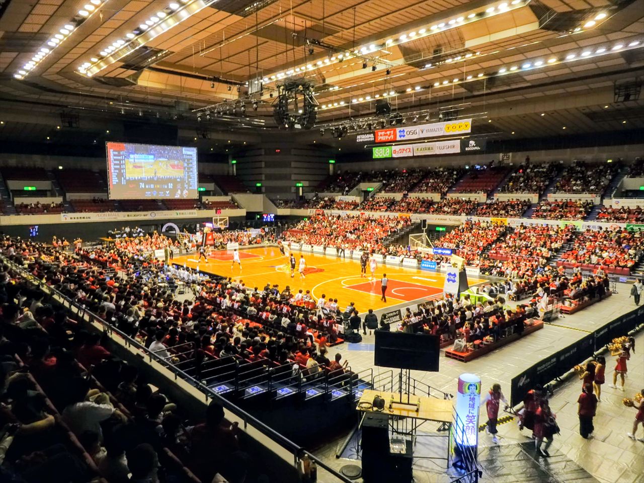 Bリーグ開催時は中央に吊り下げタイプのスコアビジョンはなく南スタンド側のみにスクリーンが設置される事があります。