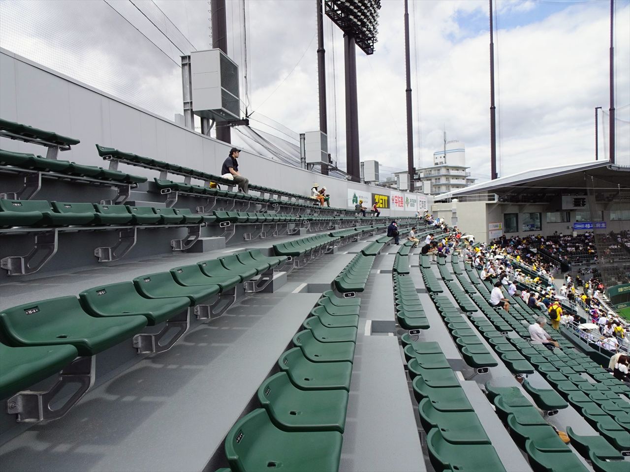 1塁側席は3塁側の約2倍の座席数があり最大22列(A~D・1~18)あり、C列後ろに横に移動できる通路があります。