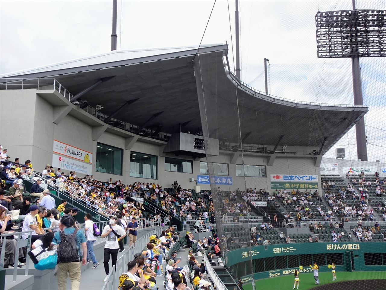 同球場は本拠地甲子園球場と同様仕様でスタンド形状は左右非対称で、ホーム一塁側のスタンドの方が多くの座席が設置されています。