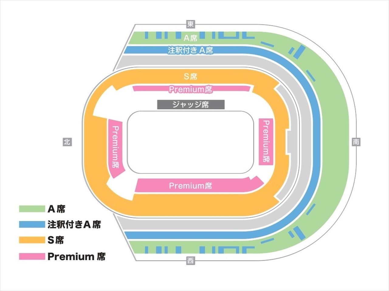 その際はサイドスタンド(ロングサイド)は13列(座席表示は9列目から21列目)、エンドスタンド(ショートサイド)はコンサート開催のステージ側、大相撲開催の向正面側が30列(座席表示は1列目から30列目)、各入場ゲート側が22列(座席表示は1列目から22列目)となります。