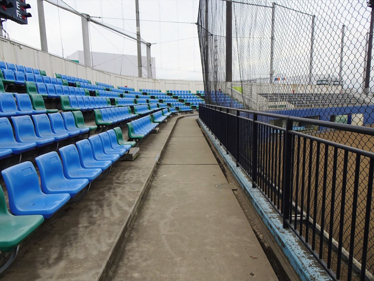 座席は6列あり、バックネット裏は背もたれ付きのセパレートタイプ、内野スタンドはベンチシートで最前列と最上段に横に移動できる通路があります。