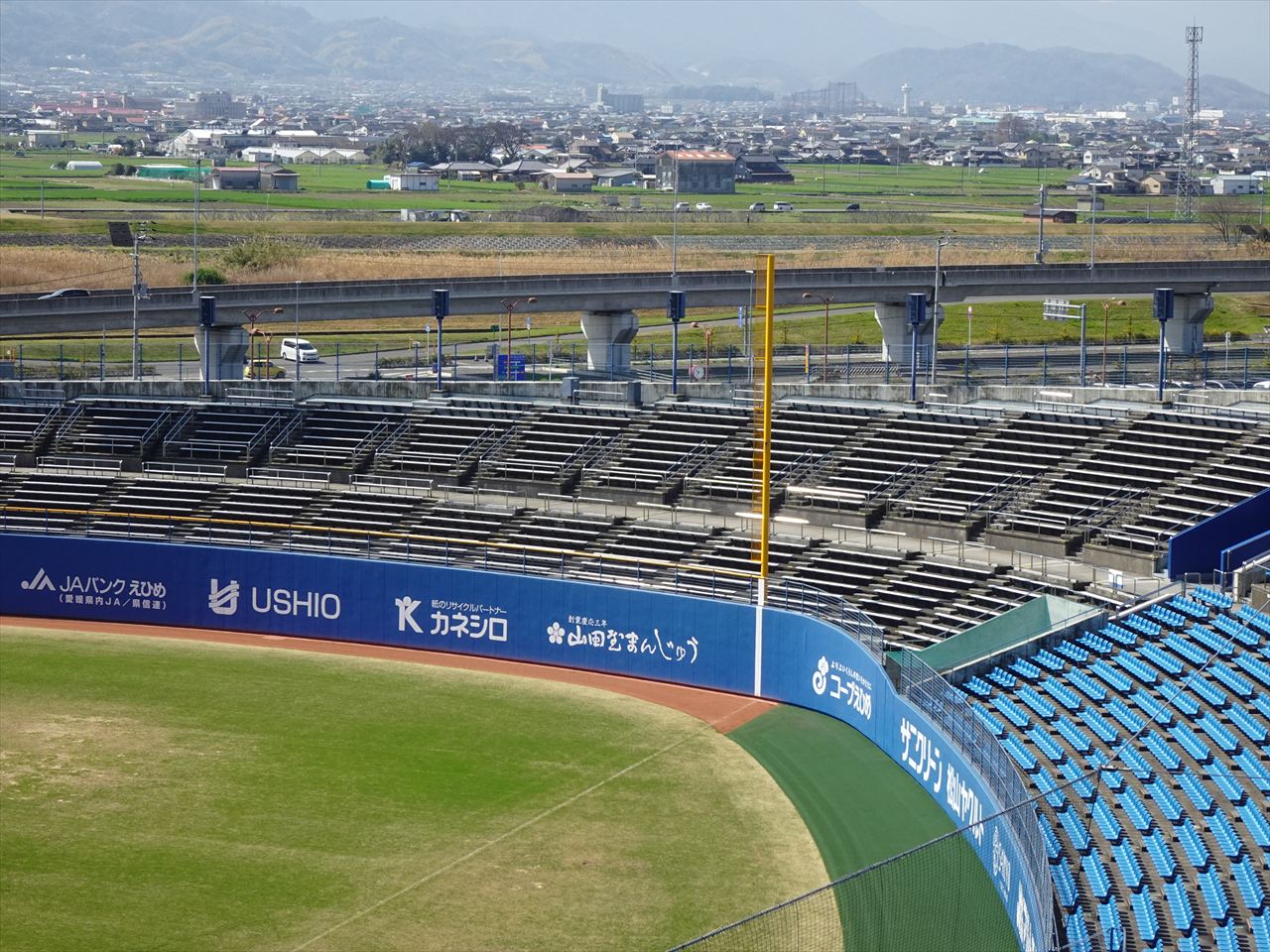 坊ちゃんスタジアは2階内野席全体の後方10列ぐらいが屋根に覆われています。