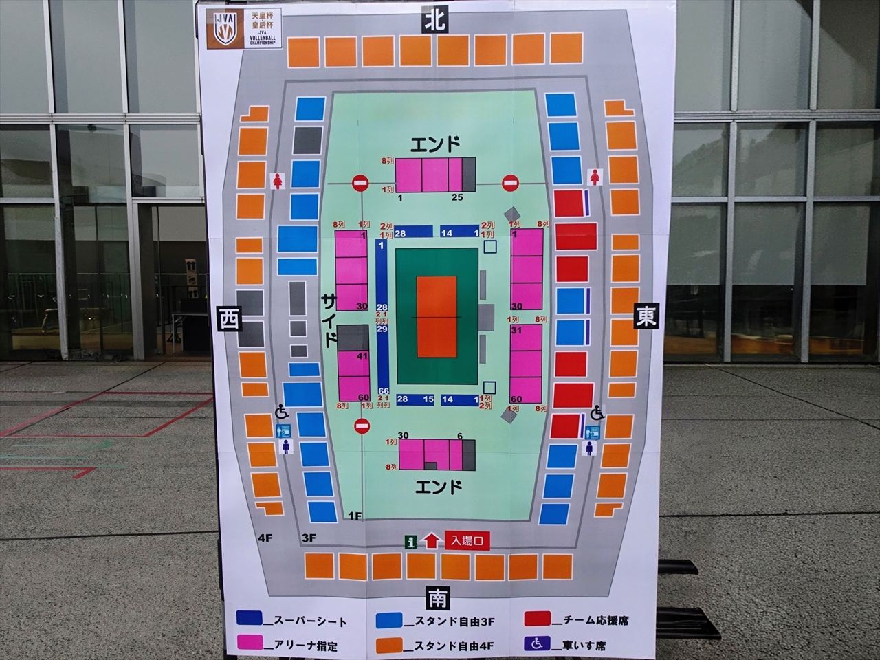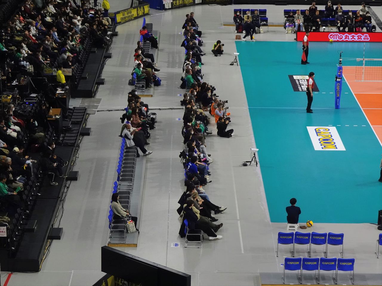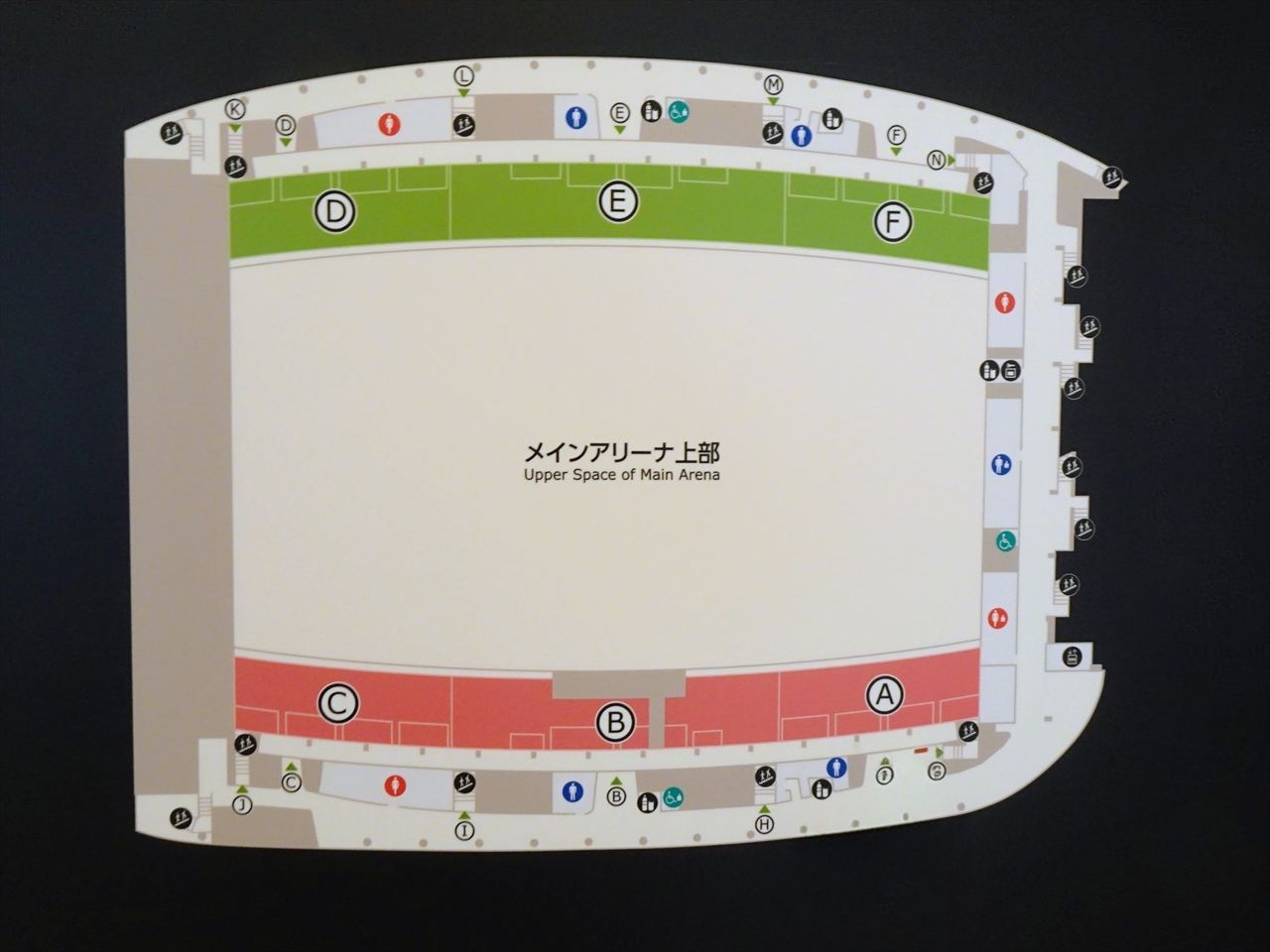 ベンチ側の東スタンド(Eブロック)、ベンチ向側の西スタンド(Bブロック)がコート範囲にある席でA・C・D・Fブロックはコートを斜めから観る感じになります。