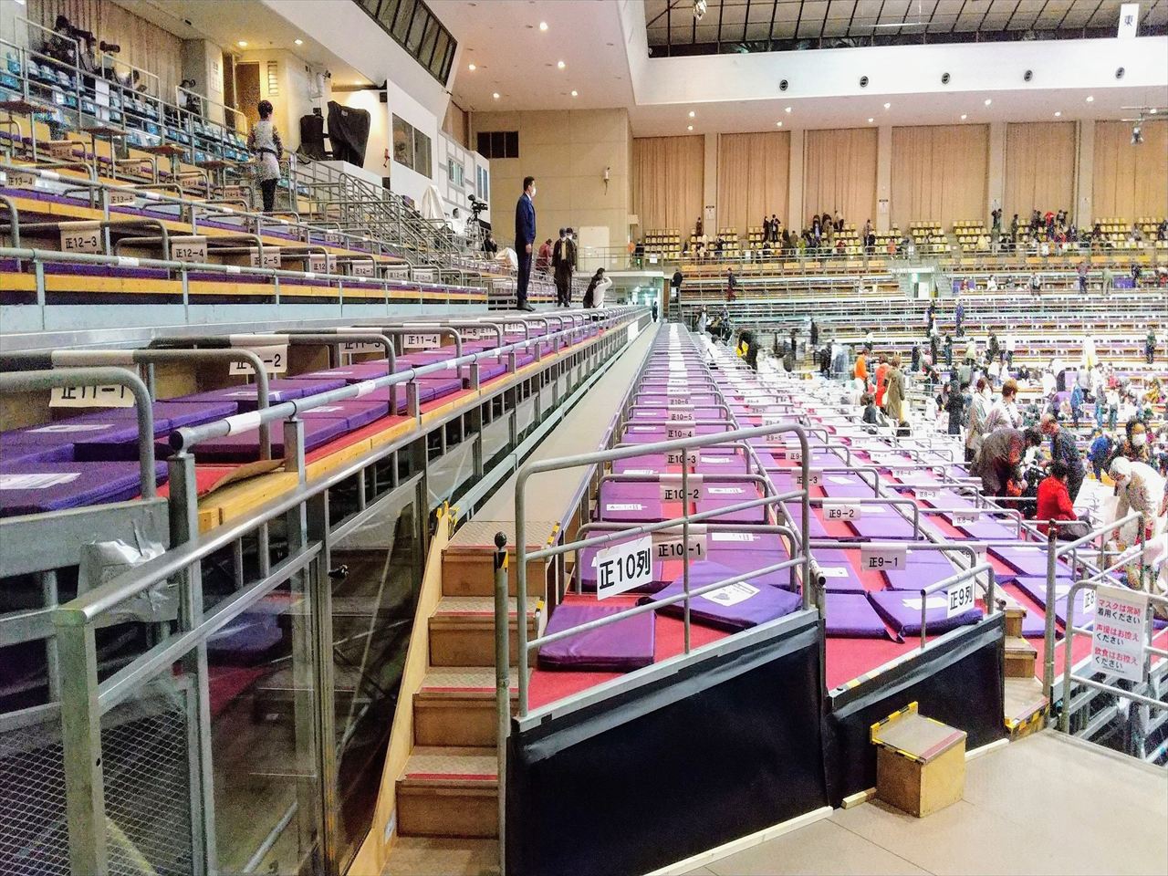 九州場所は相撲専用会場である両国国技館と異なり約5,000m2の間仕切り柱のないフラットな空間から常設されている3階スタンドまでの高さに仮設のスタンド(マス席)を組み上げるスタイルになります。