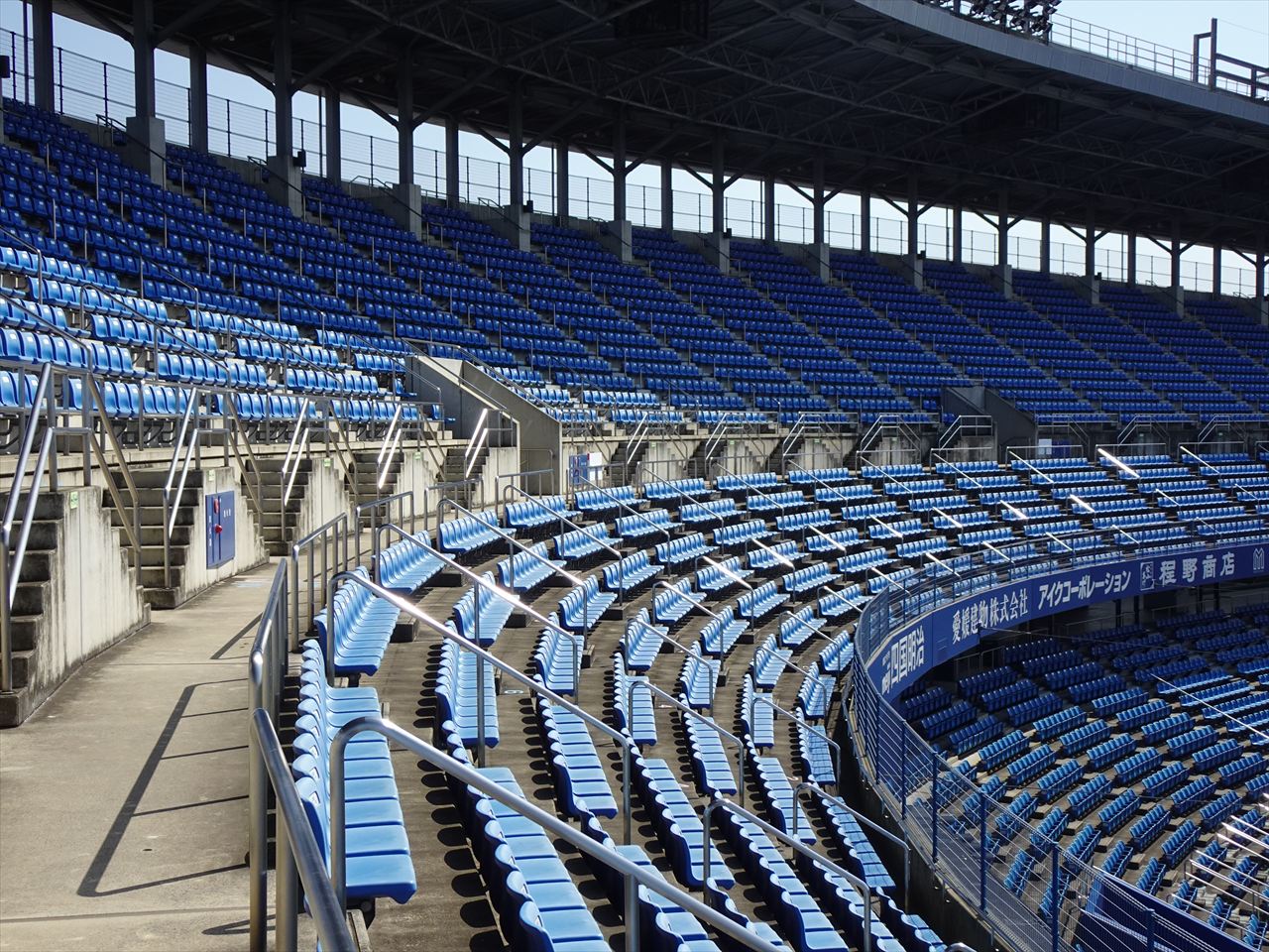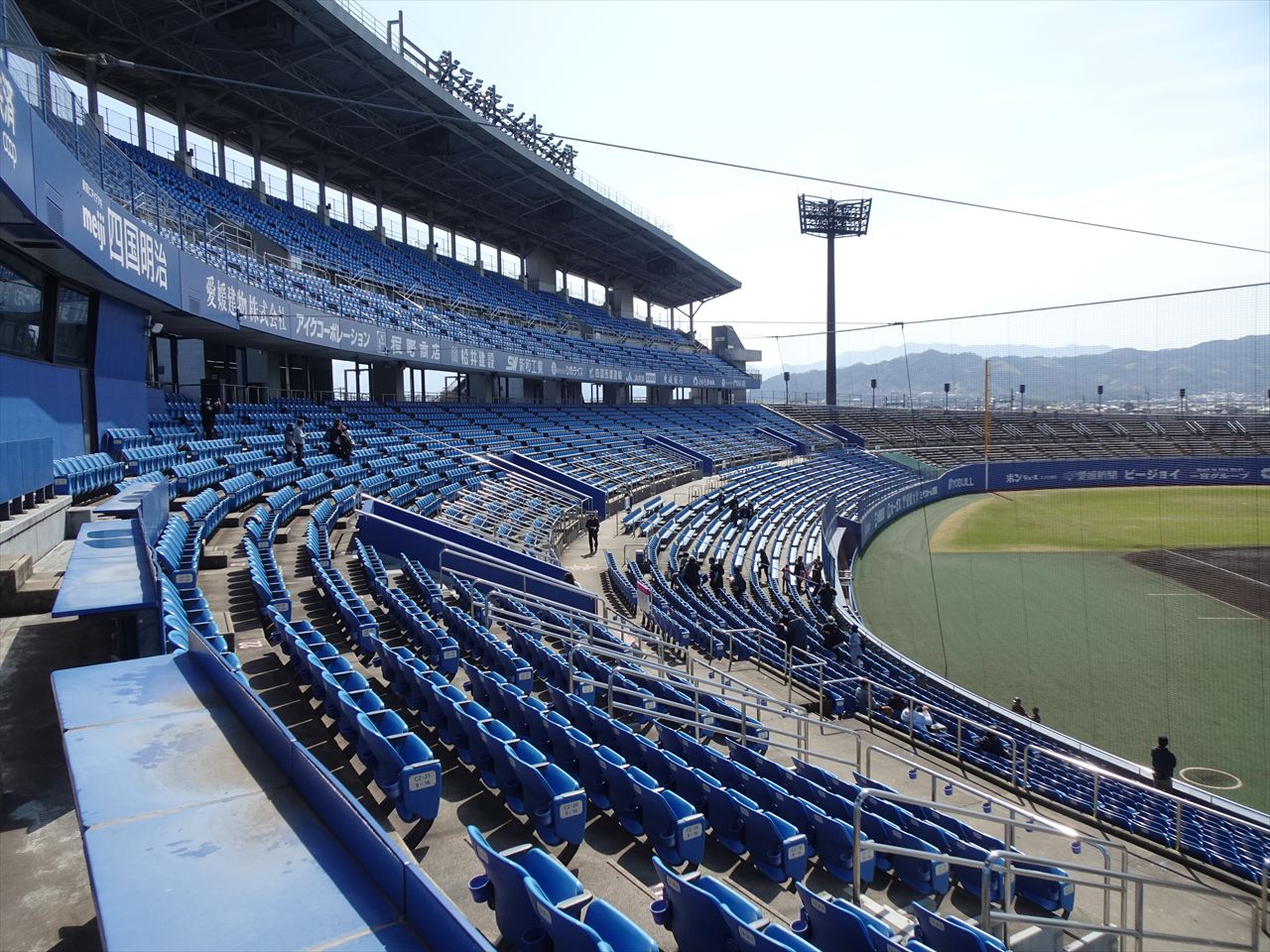 坊ちゃんスタジアは2階内野席全体の後方10列ぐらいが屋根に覆われています。