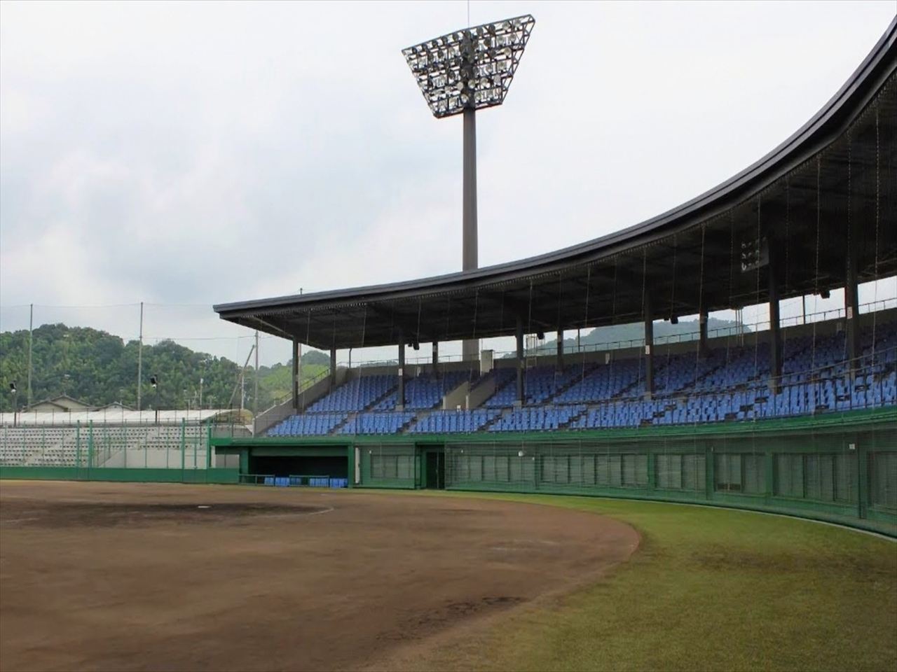 今治市営球場は1層のスタンドでメインスタンド(バックネット裏)に1,621席、内野スタンドに2,772席、外野芝生に約3,200人の合計7,593人が収容人数とされています。
