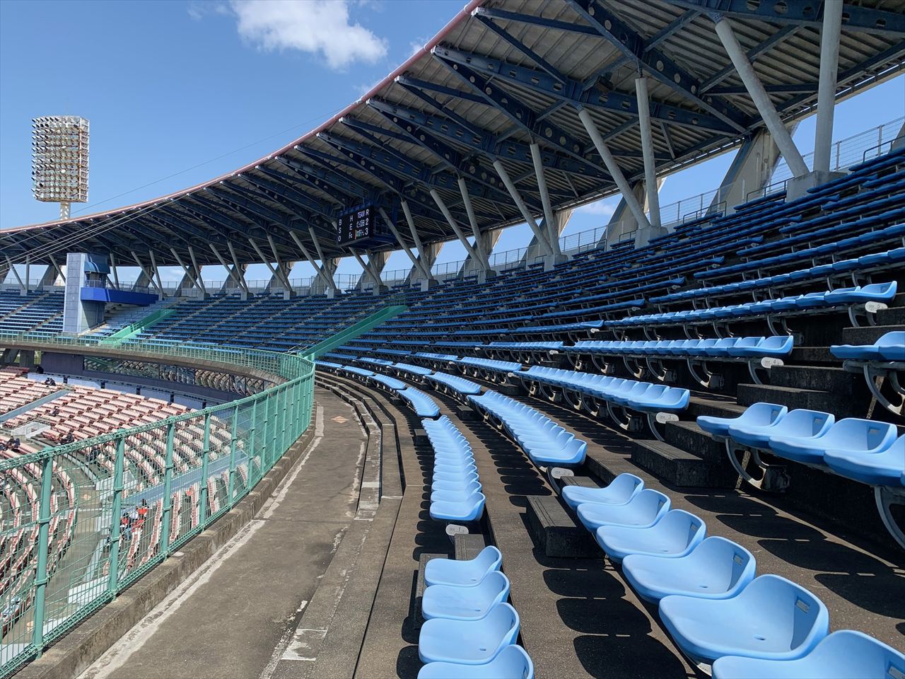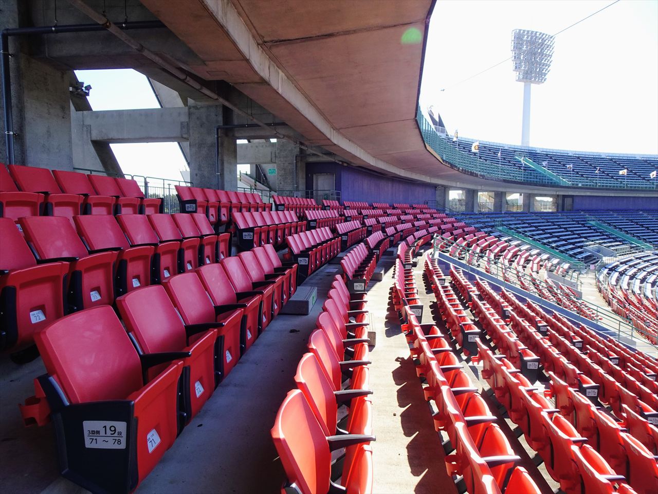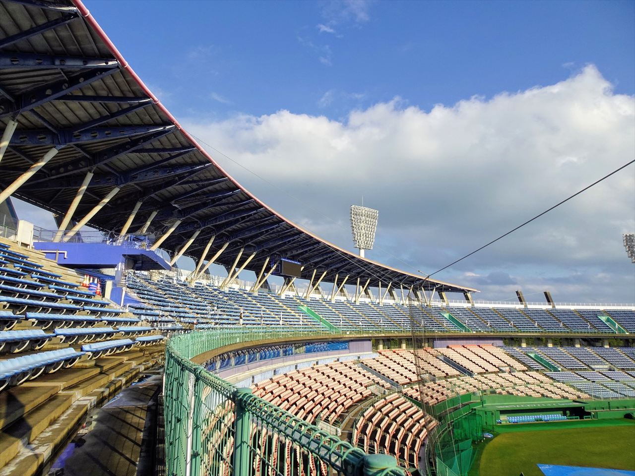 サンマリンスタジアムのスタンドは2層構造になっていて、屋根はおおまかに2階席のバックネット裏正面が中段から最上段に掛けて最も広く、2階席の1・3塁側ベース付近は最上段から2~3列程度が覆われています。