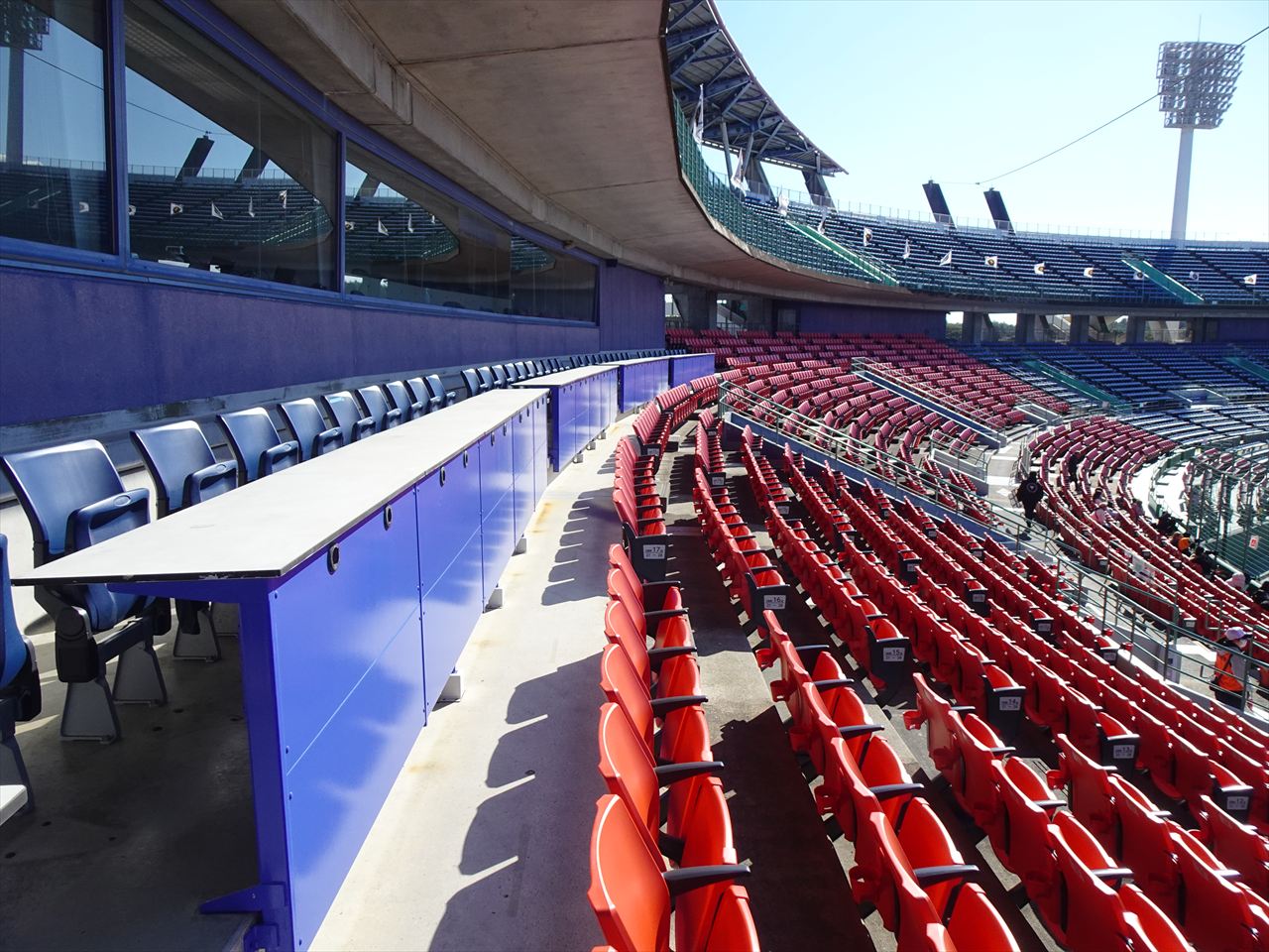 1階席は正面記者席両サイドから外野席手前までの最上段から2~3列程度が2階スタンドのひさしで覆われています。