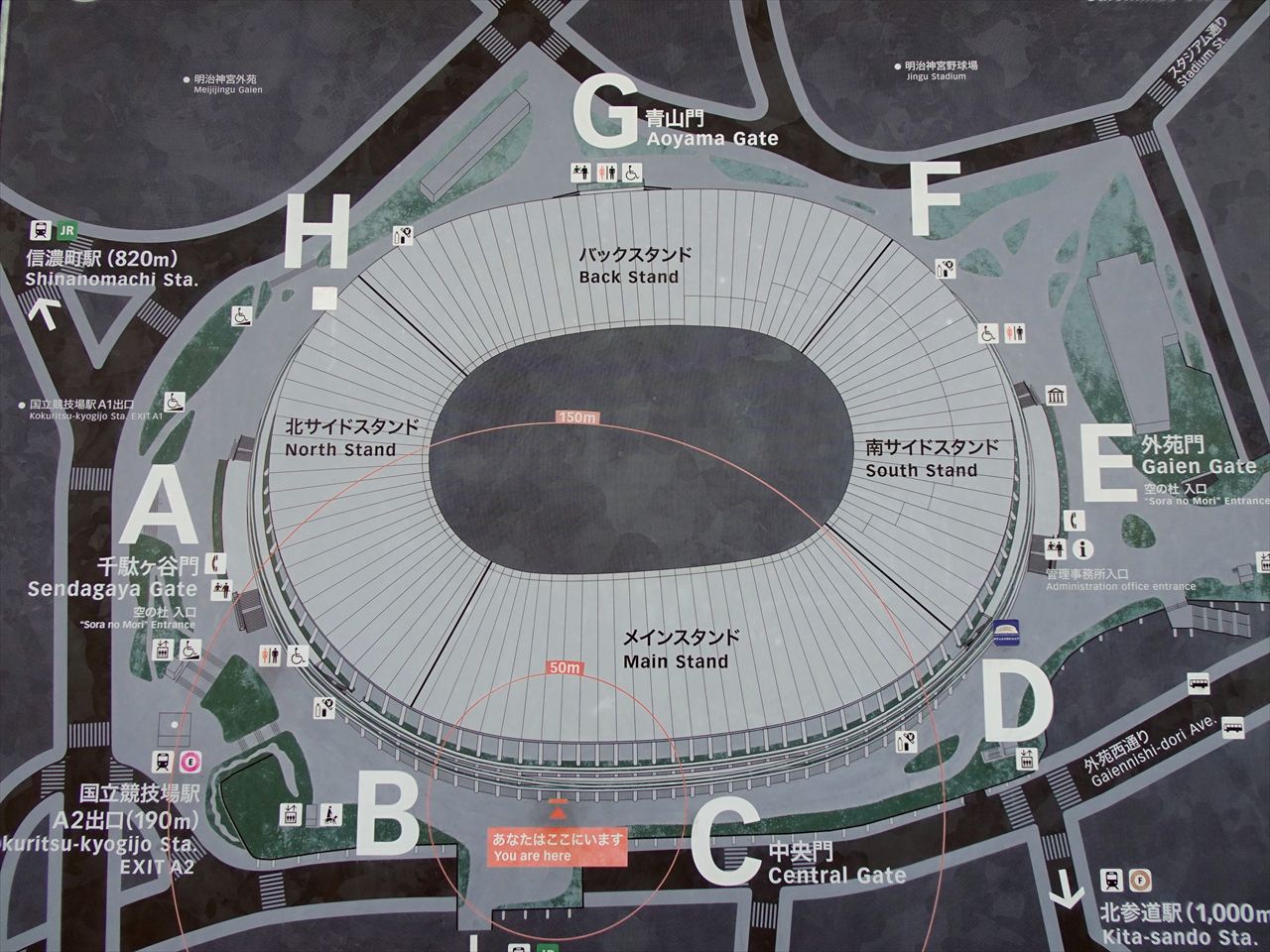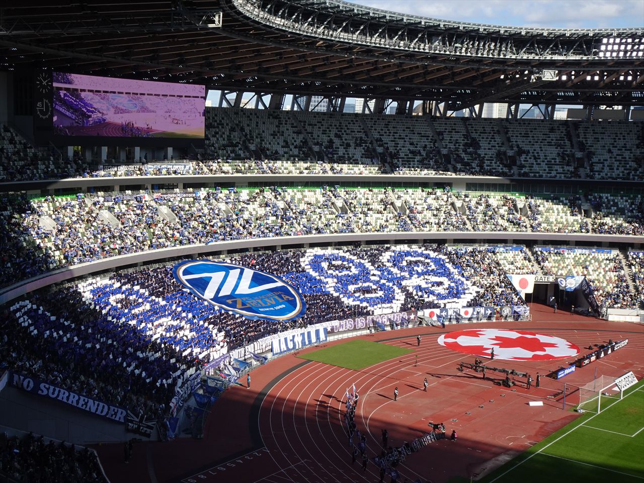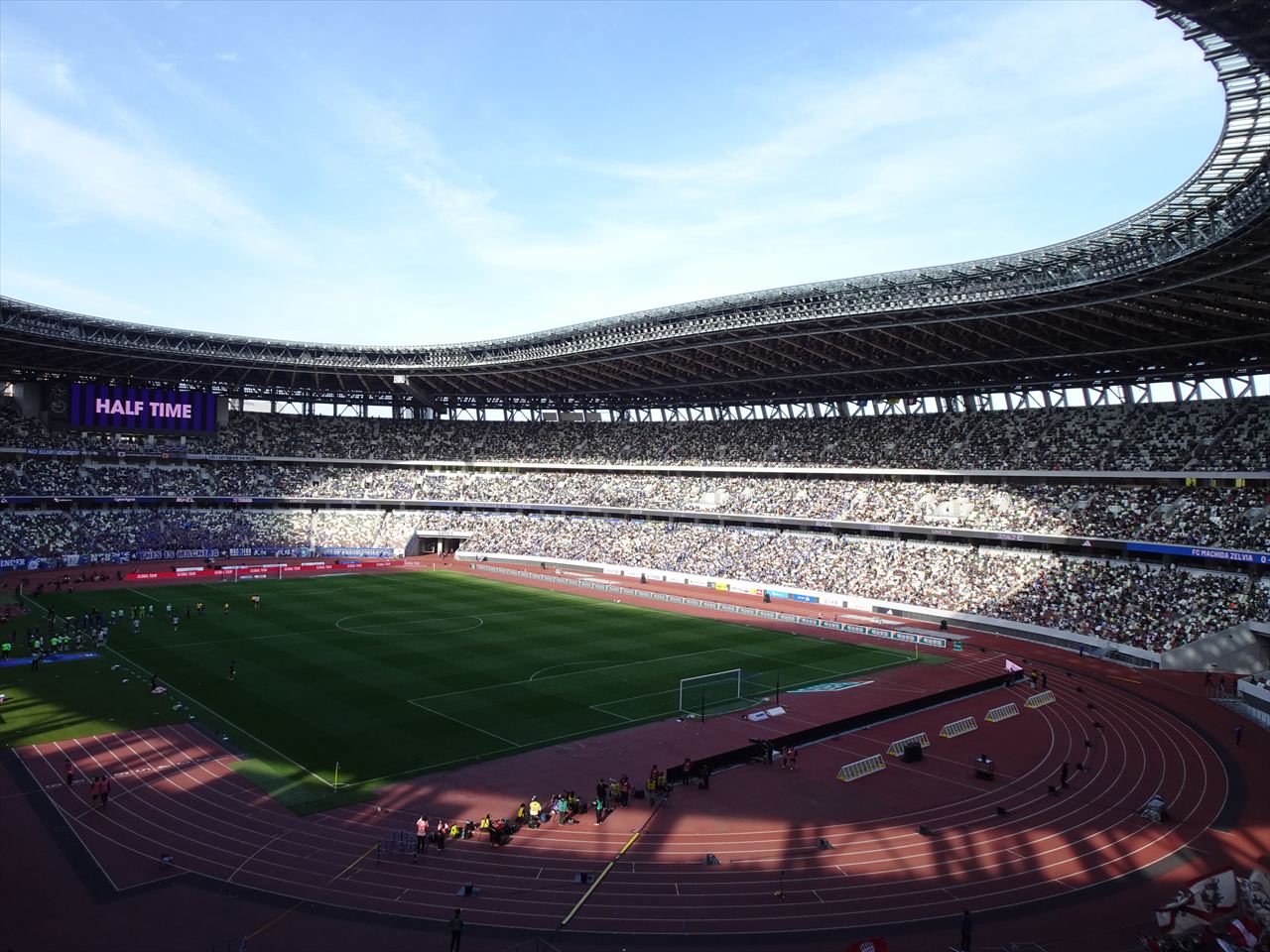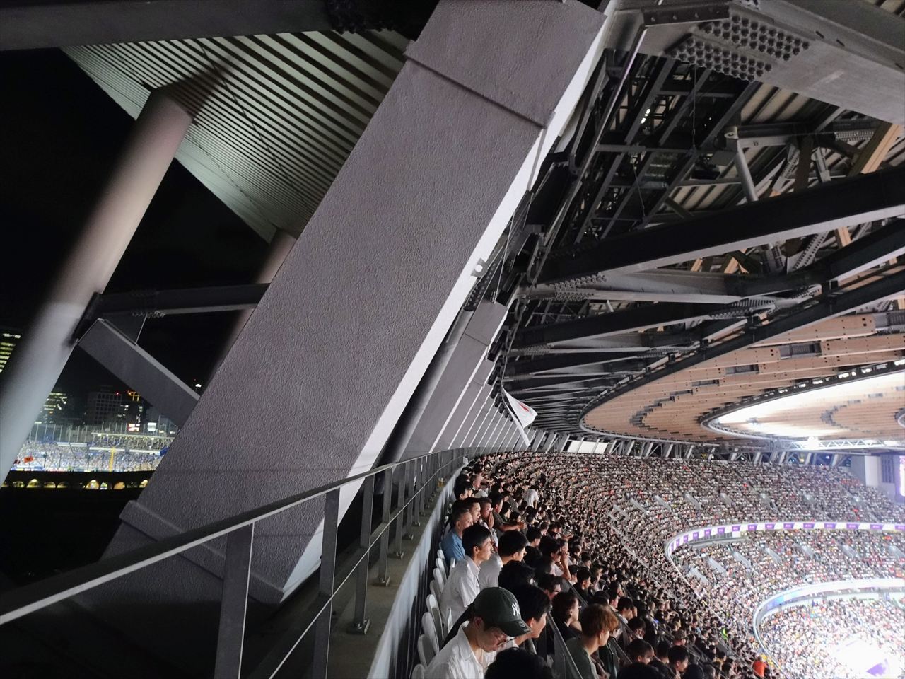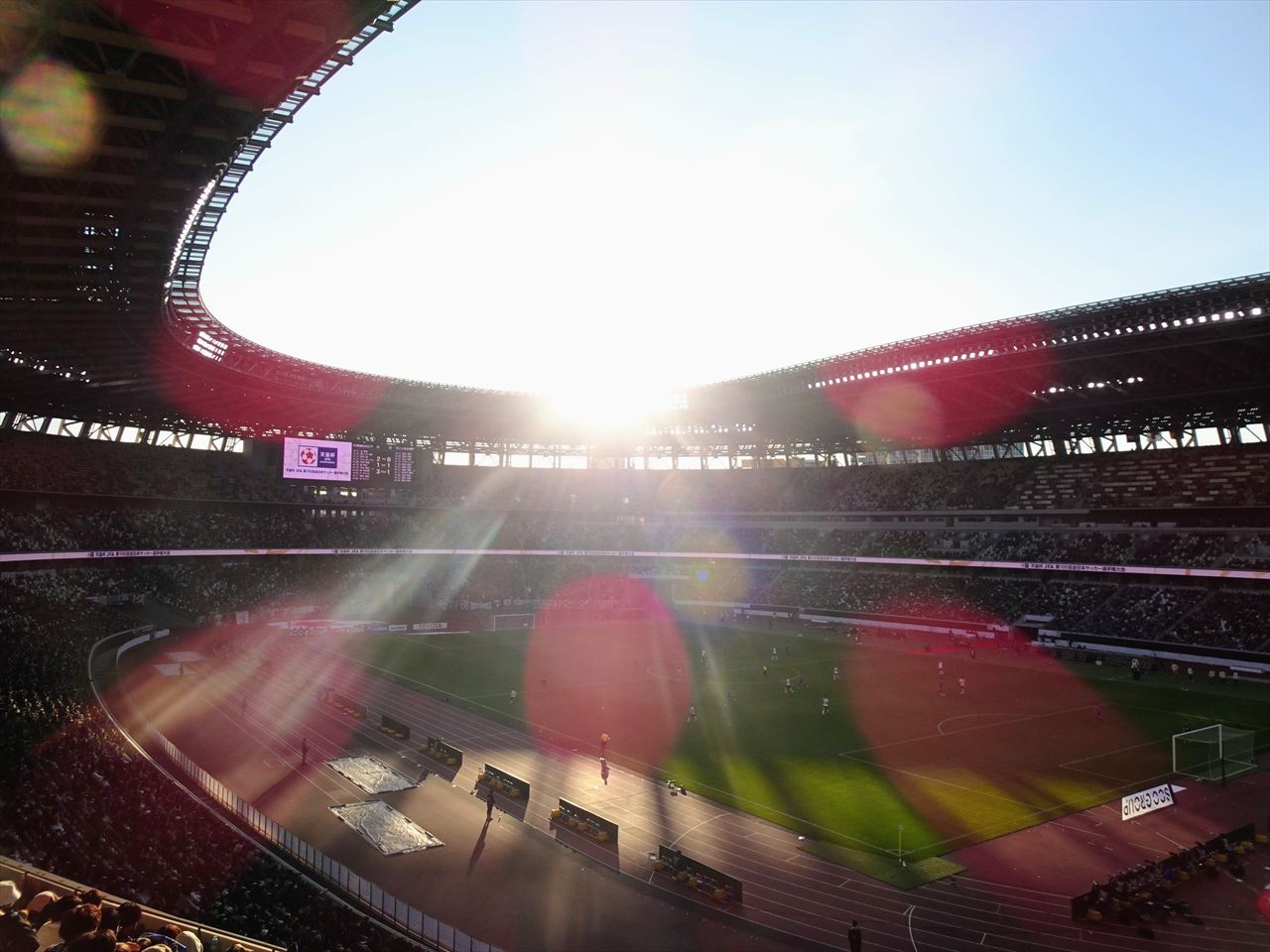 MUFGスタジアム(国立競技場)は360度屋根に覆われていますがフィールド上に屋根はなく、晴天時の午後から日没にかけて太陽の高さで西日を浴びるエリアが変動していきます。