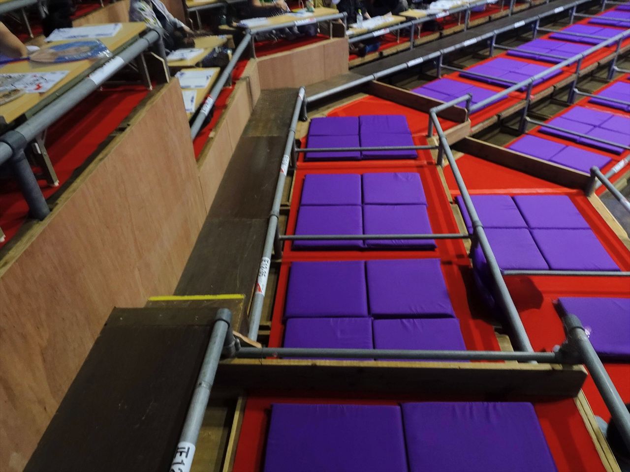 2階席は全てイス席で正面/向正面は9列、東側/西側は11列あり、おおよそ12席ごとに通路があります。