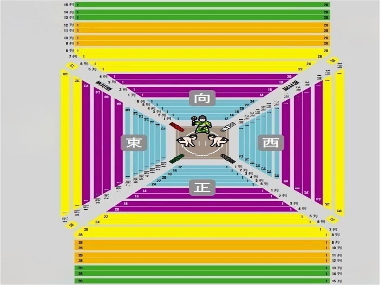 正面/向正面は土俵に近い順にS席(1~4列)、A席(5~8列)、B席(9~12列)、C席(13~15列目 )で14〜15列目はテーブル付き2人マスC席として販売されています。