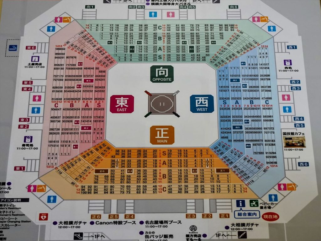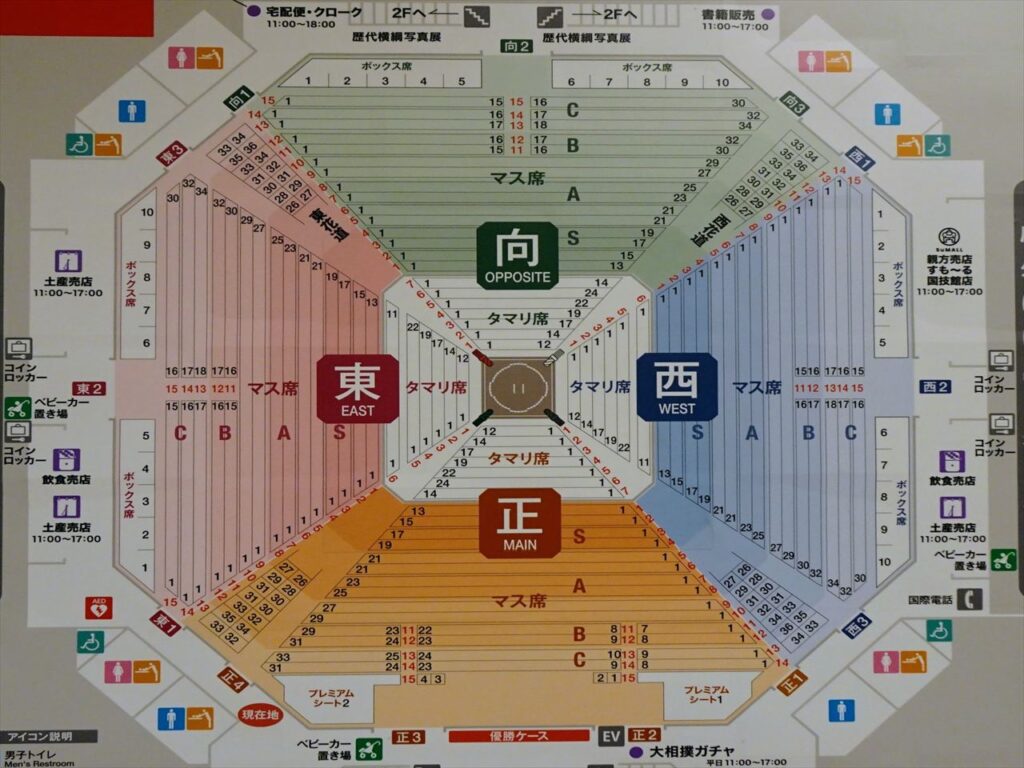 1階席は土俵に近い座席から順にタマリ席(正・向7列 / 東・西6列 434席)、マスS席(4列・256マス)、マスA席(4列・368マス)、マスB席(4列・484マス)、マスC席(3列・368マス)となります。