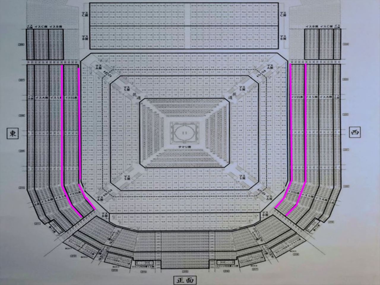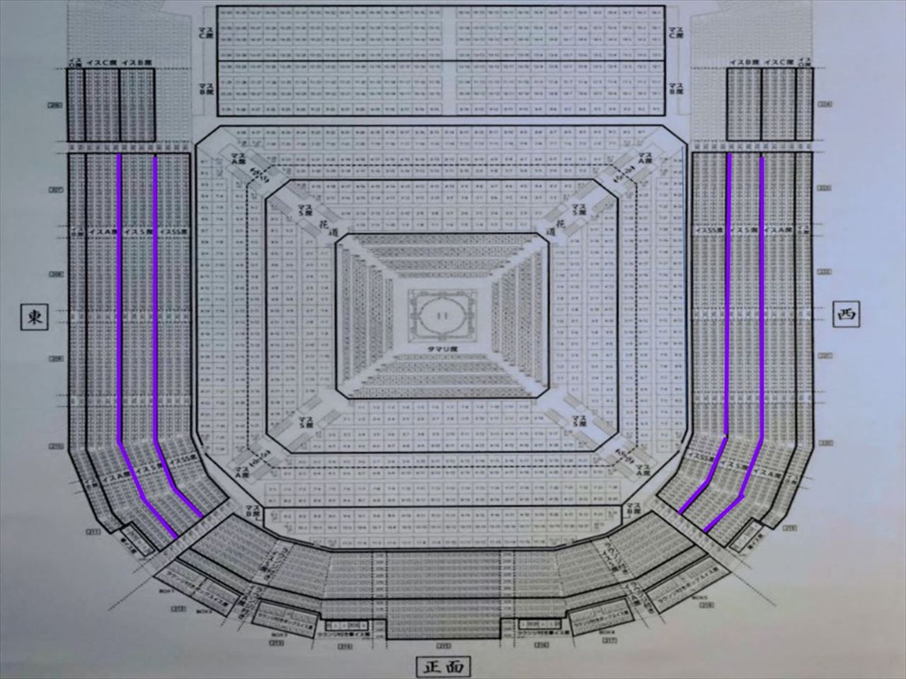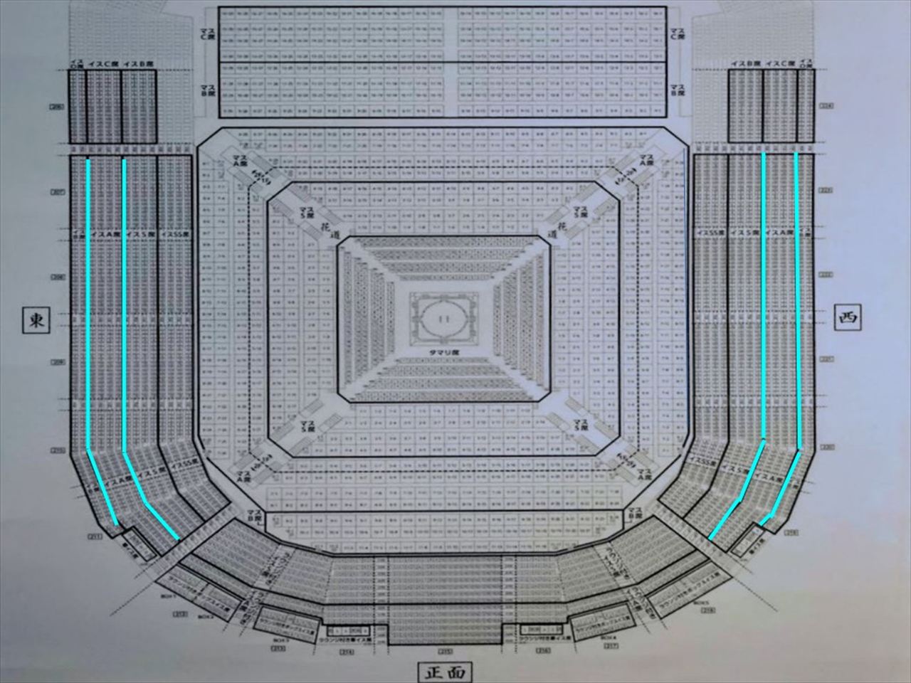 名古屋場所では1人マス、2人マス、4人マスの3種類で正面が11列、向正面が16列、東と西は8列となります。