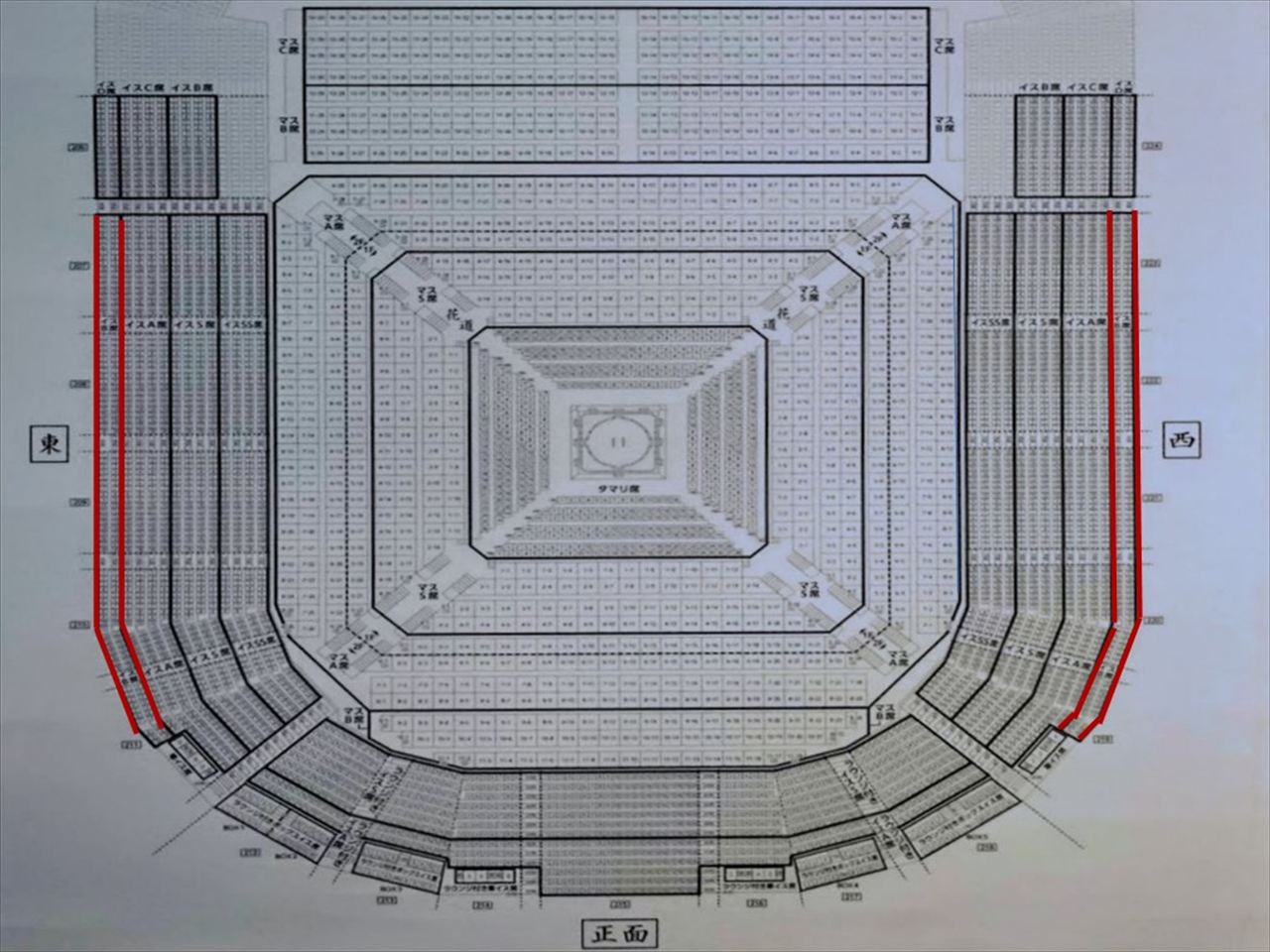 イス席はマス席のすぐ後ろから始まる座席で東側と西側のみにあります。