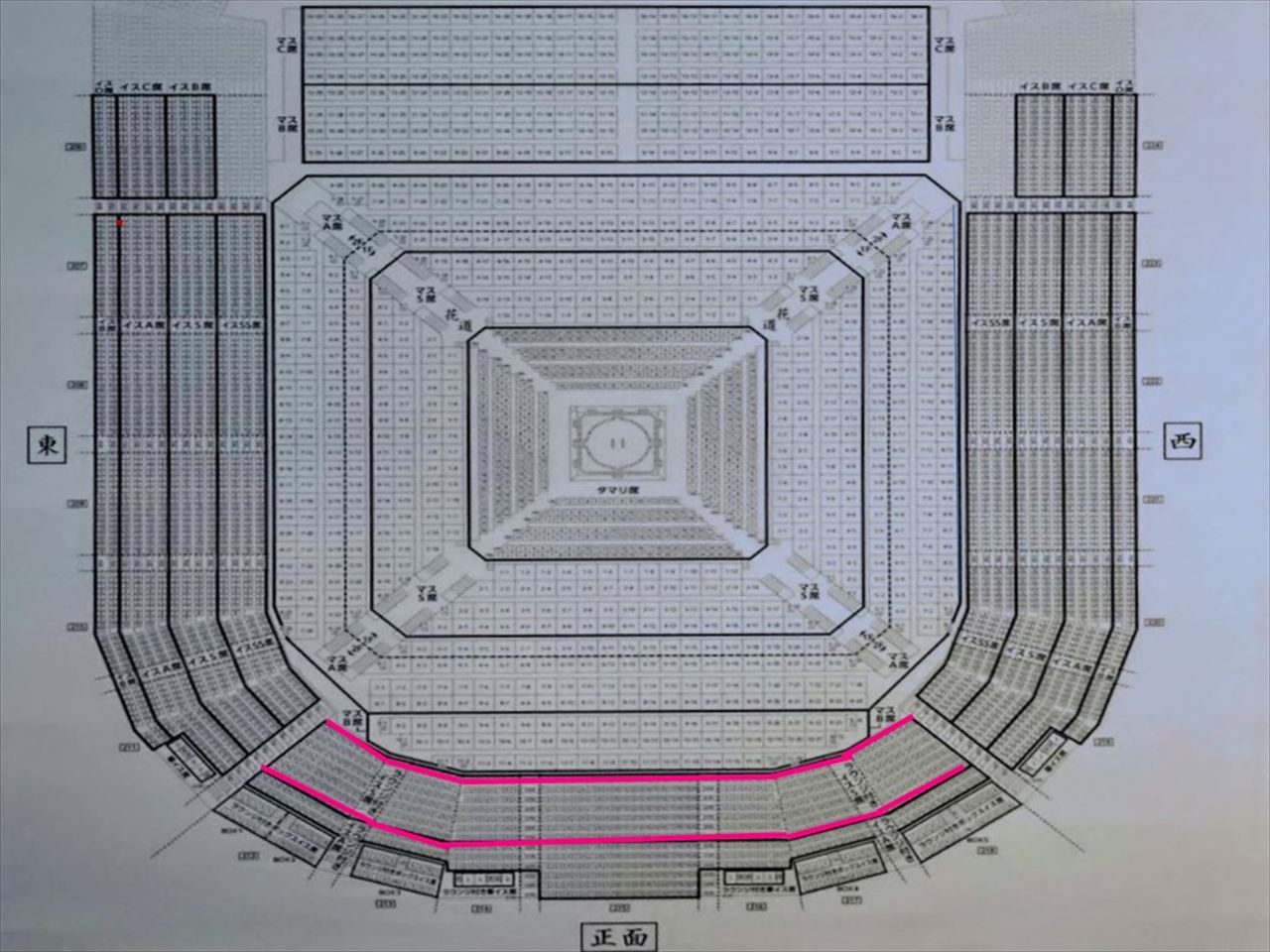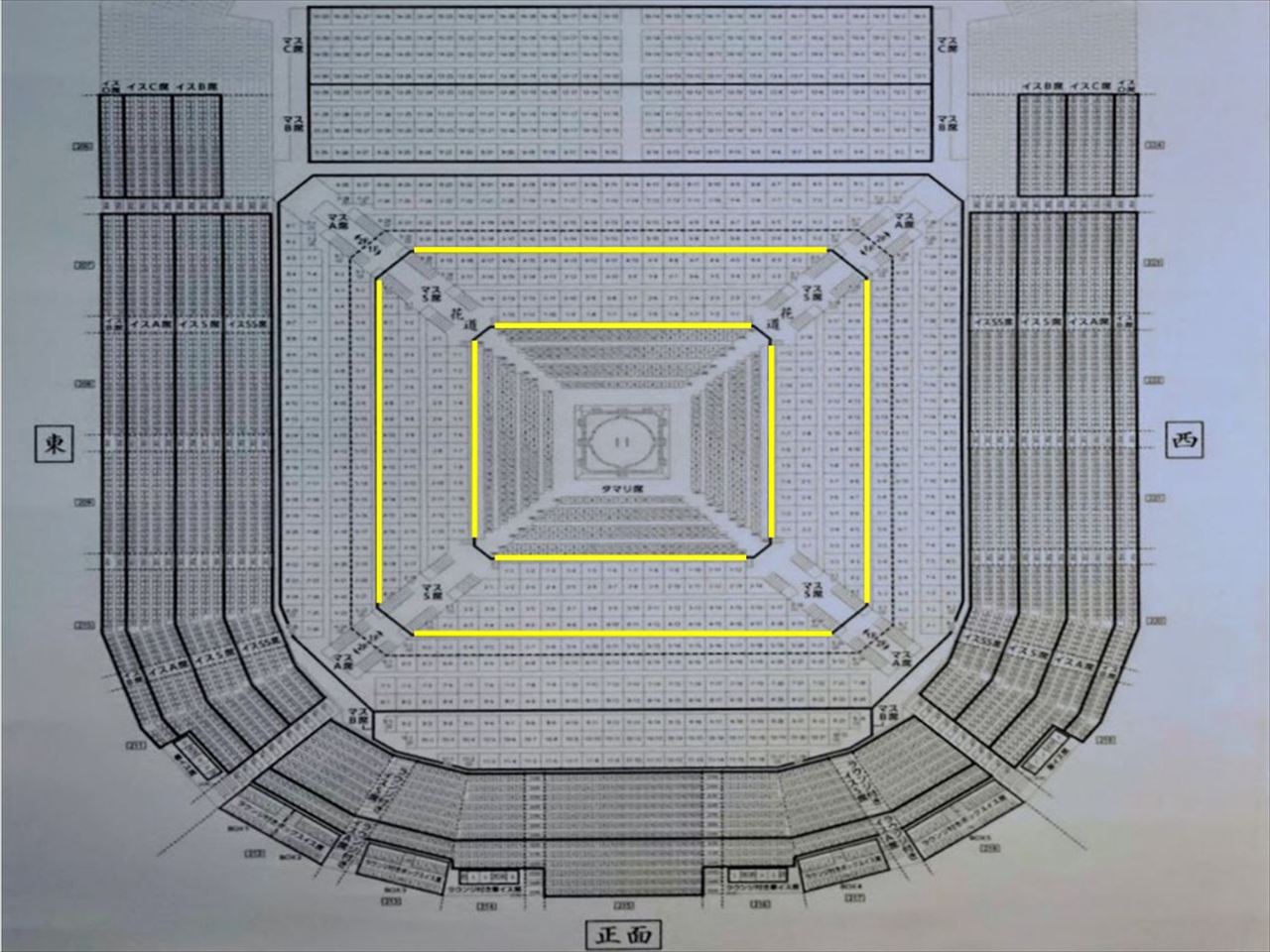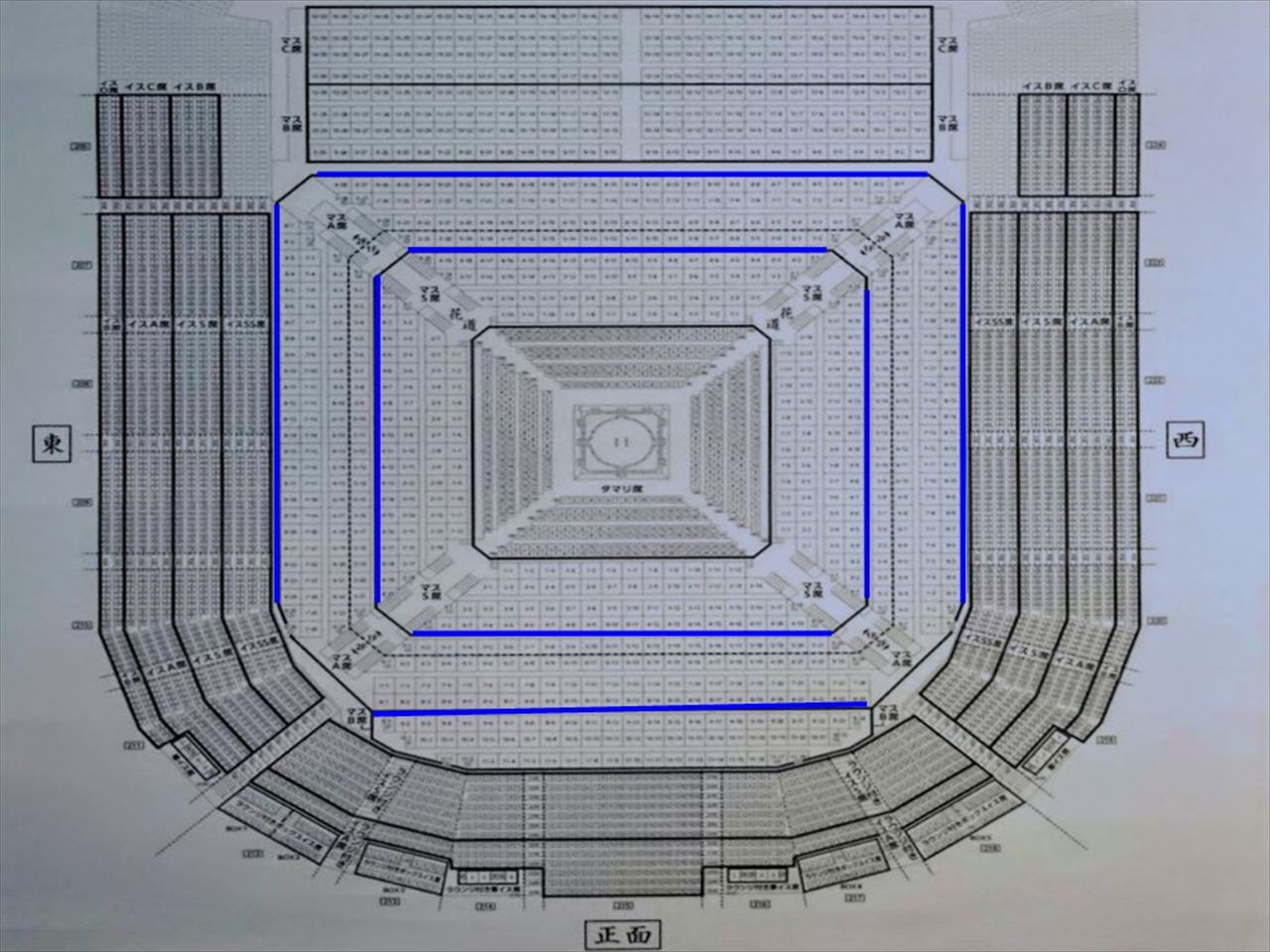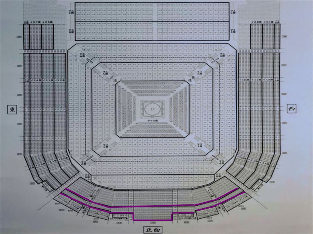 タマリ席は土俵に最も近い座布団敷きの一般購入が難しい正面/向正面7列・東側/西側6列ある特別席です。