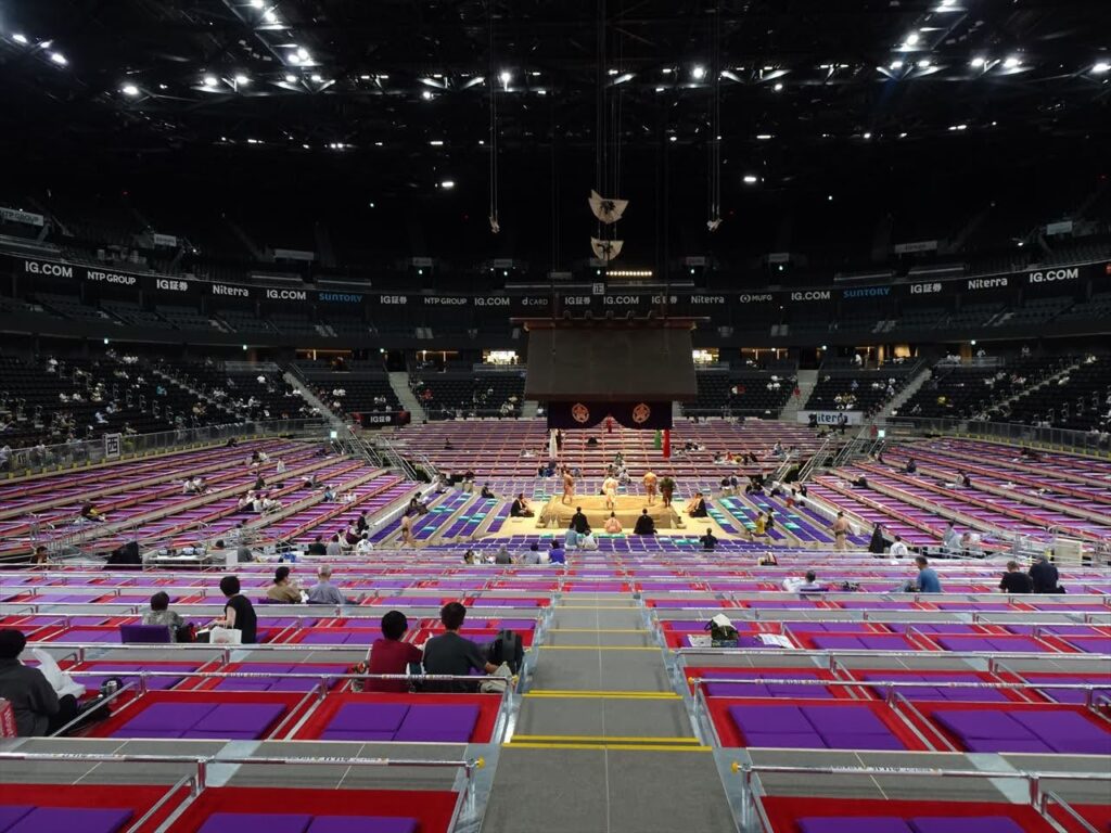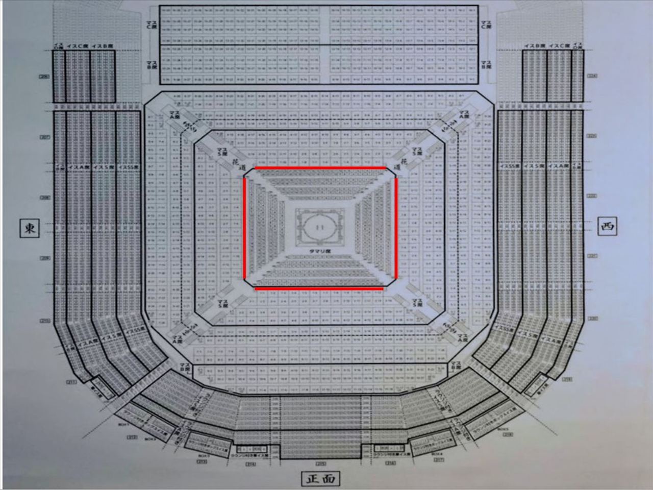 両国国技館のように1階がマス席、2階がイス席ではないため、フェンスで区切られていてマス席のすぐ後ろにイス席があります。
