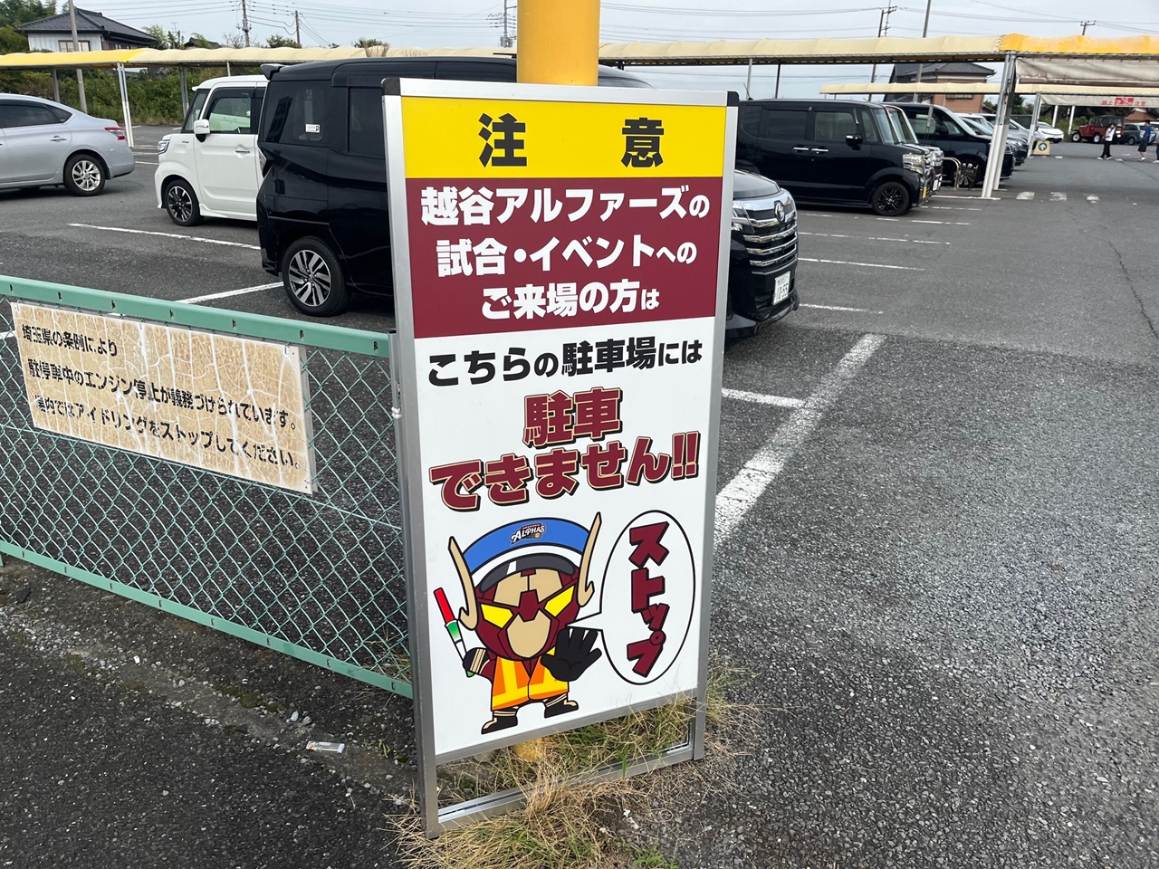 試合開始前後までは係員が誘導しています。また以下のように越谷アルファーズの試合に来るファンが停めれるエリアと、お店のお客さんが停めるエリアとでしっかりと線引きされています。