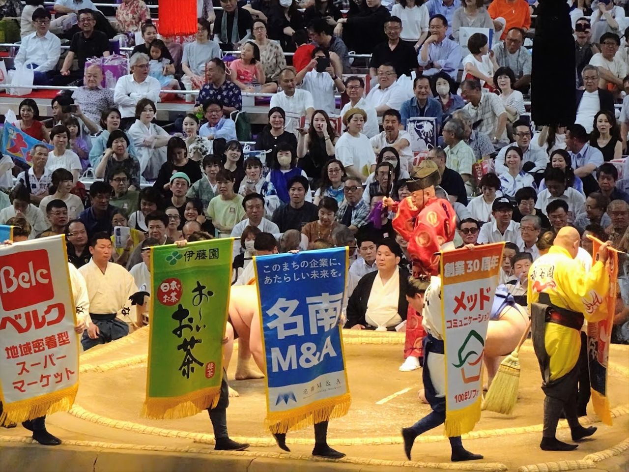 懸賞は、幕内取組で勝利した力士が受取る賞金で、懸賞主を募り作成した懸賞旗を土俵上で掲げ自社の宣伝を行います。