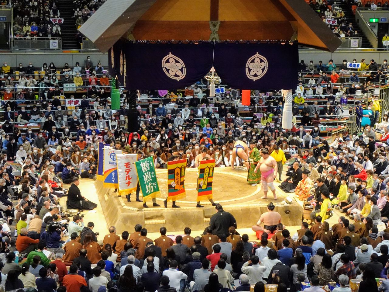 懸賞は、幕内取組で勝利した力士が受取る賞金で、懸賞主を募り作成した懸賞旗を土俵上で掲げ自社の宣伝を行います。